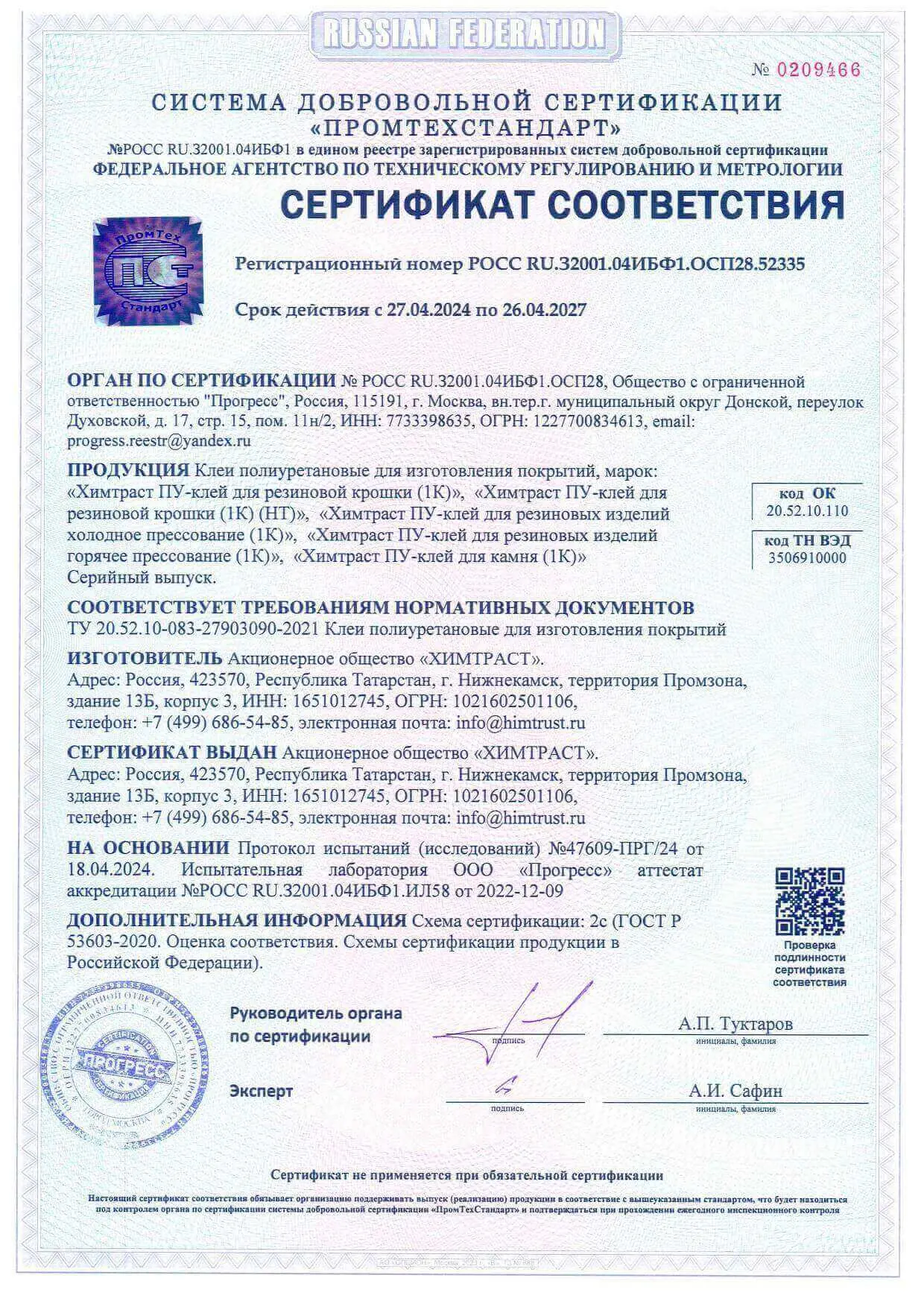 Сертификат соответствия на полиуретановый клей для изготовления покрытий